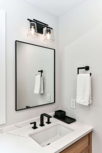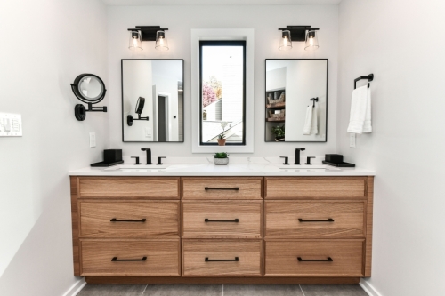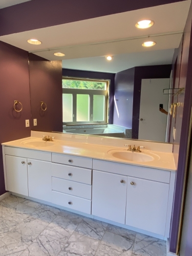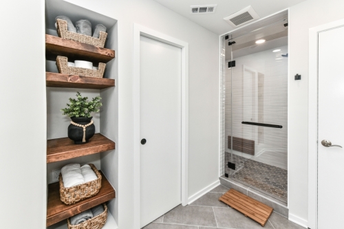 Situated in a beautiful neighborhood near a lake with lots of walking trails and green space, the location of this single family home in Reston was perfect but our clients were ready to create updated spaces that better suited their aesthetic and lifestyle. In the Primary Bathroom, our clients were ready to make some BIG changes! The floorplan of the bathroom was completely reconfigured. They wanted to remove the oversized tub and go tub-free. We moved the double vanity to the prior location of the tub and created a stunning double shower in the space where a small shower stall and toilet once stood. We moved the location of the toilet and created privacy with a separate toilet room with a pocket door instead.