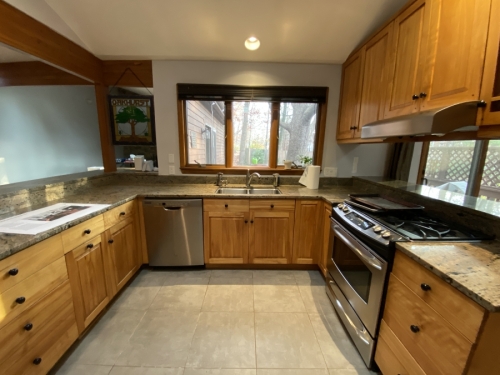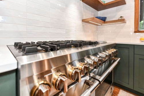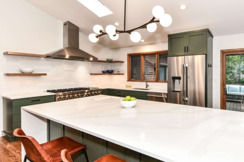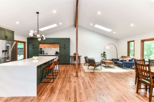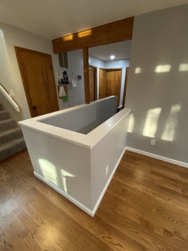 On the main level, the existing Kitchen was small given the square footage of the home. It was sectioned off in a corner of the expansive main living area, with lots of walls and half-walls that weren’t showcasing the beautiful architecture of the space. We closed off the walls to the entryway area and to the Family Room at the back of the home, and created a much larger Kitchen that now flows into a Dining area and Great Room.