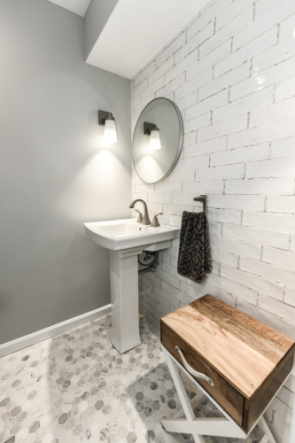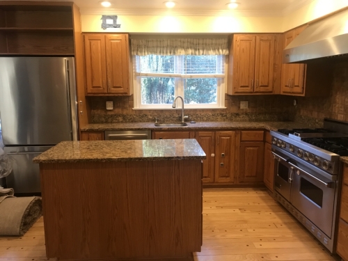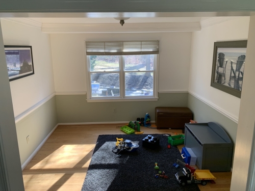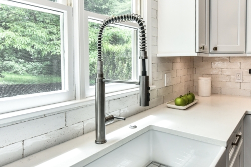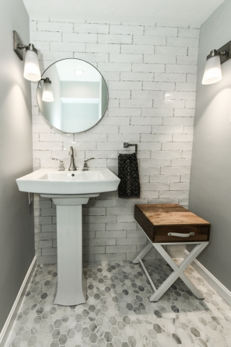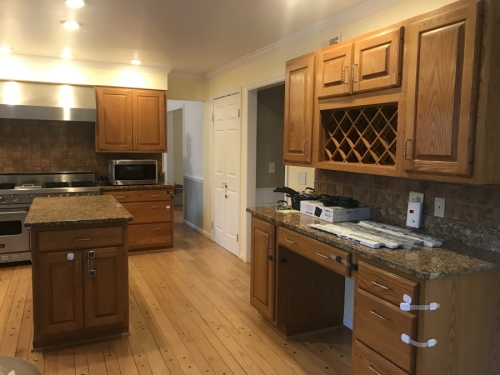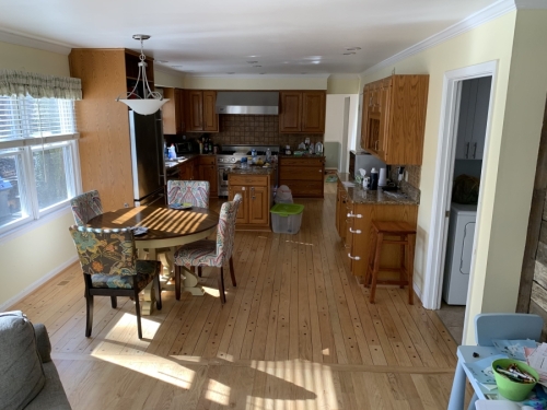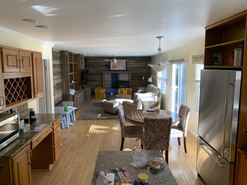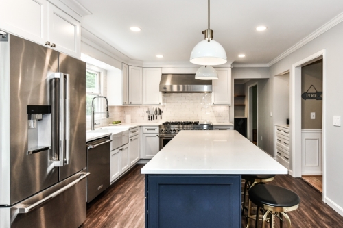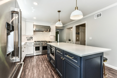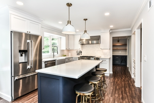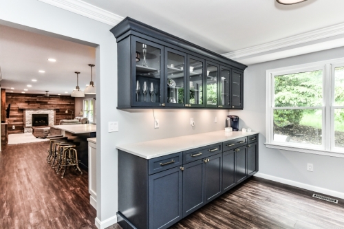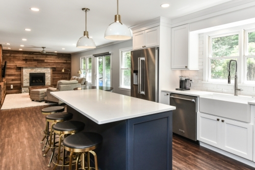 This lovely Oakton home has plenty of space, but the Homeowners wanted an updated look as well as improved functionality on the main level for their growing family. Enter Synergy Design & Construction! The Kitchen was the starting point for this remodel, where we created a transitional style that is also family-friendly. Existing rustic shiplap and shelving in the Family Room (which adjoins the Kitchen) was incorporated into the new design, but we updated the fireplace surround with a sleek stacked stone so the new aesthetics blend seamlessly throughout the entire space.