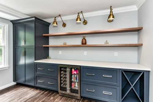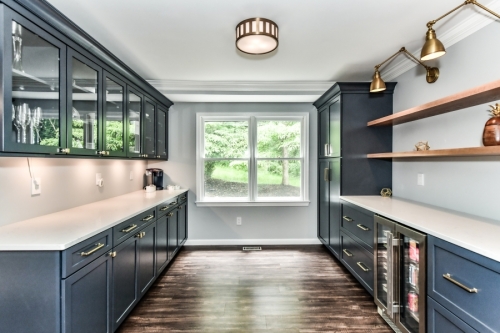 Originally a Dining Room and most recently used as a playroom, the room beside the Kitchen was turned into a Butler’s Pantry, with tons of storage and prep space. We used a similar cabinetry color as the Kitchen island so one room flows to the next, making it feel like it’s part of a coordinating space, not a completely separate room.