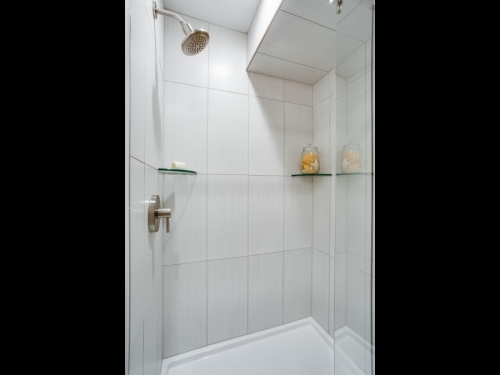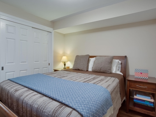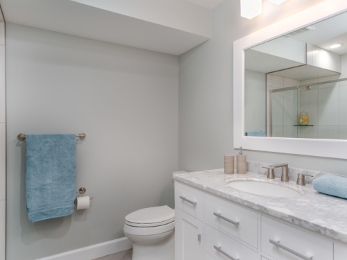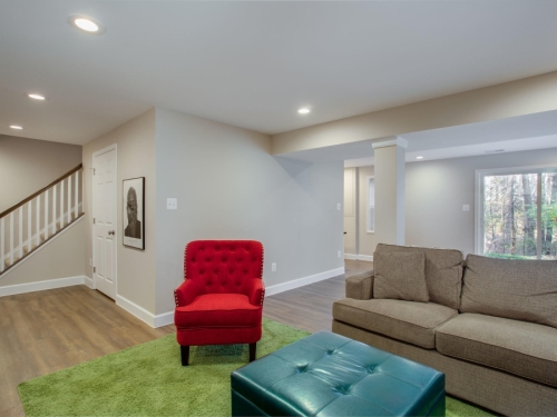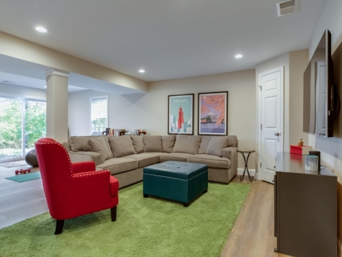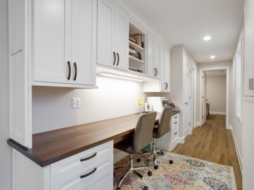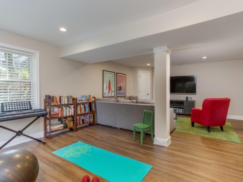We transformed the unfinished and under-used basement of this home in Reston to provide this family of five with family-friendly spaces to enjoy time together as well as creating a private guest bedroom and bathroom when out-of-town visitors come to stay. The finishing touch? A built-in office with room for two when working from home or for the kids to use as homework/crafting space.